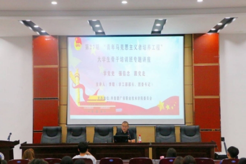 共青团广安职业技术学院委员会于明德楼先圣厅开展了青年马克思主义者培训工程大学生骨干培训班专题讲座,讲座先后分别由李聪老师和王紫元老师进行主持。本期讲座增强了我校学子政治素养、提高了思想境界、优化了自身能力、锤炼了作风品格,引导我校学子树立“四个意识”,坚定“四个自信”,强化“四个正确认识”。为新时代的发展培养了大批用习近平新时代中国特色社会主义思想武装的青年学生政治骨干。