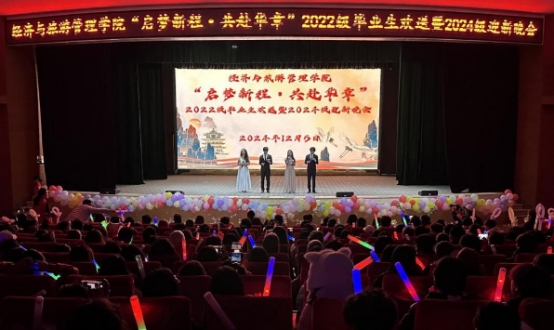 2024年12月5日晚,经济与旅游管理学院2022级毕业生欢送暨2024级迎新晚会在杏坛隆重举行,学院党总支书记吴小平、副书记杨燕、各科室老师、辅导员、大一与大三全体学生参与了本次晚会。同时,本次活动还特别邀请了对外交流与合作处老师、留学生辅导员和全体留学生参加。