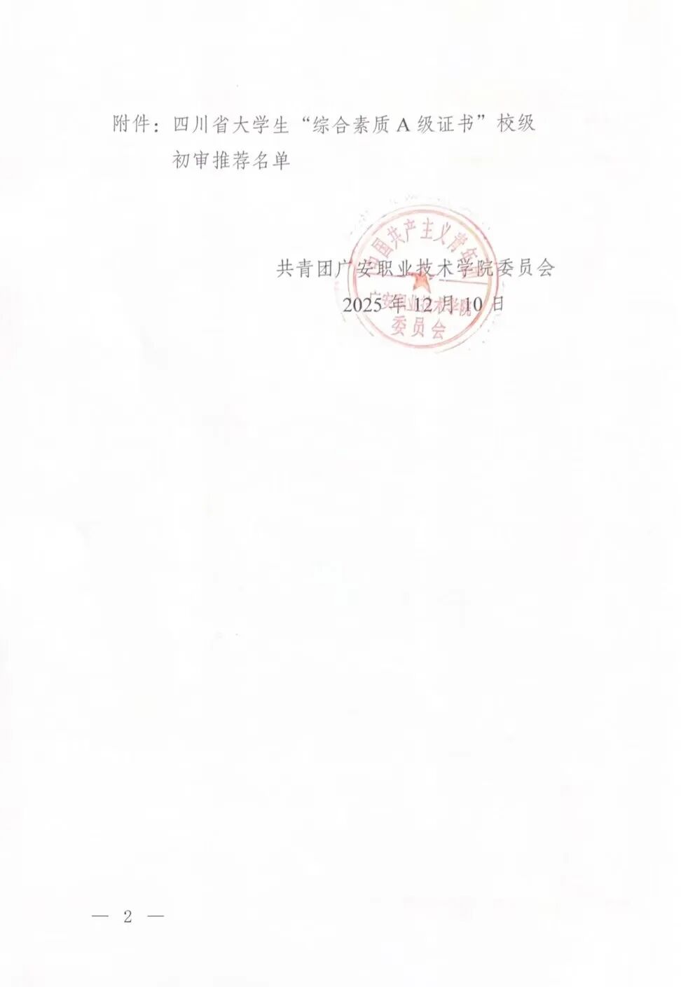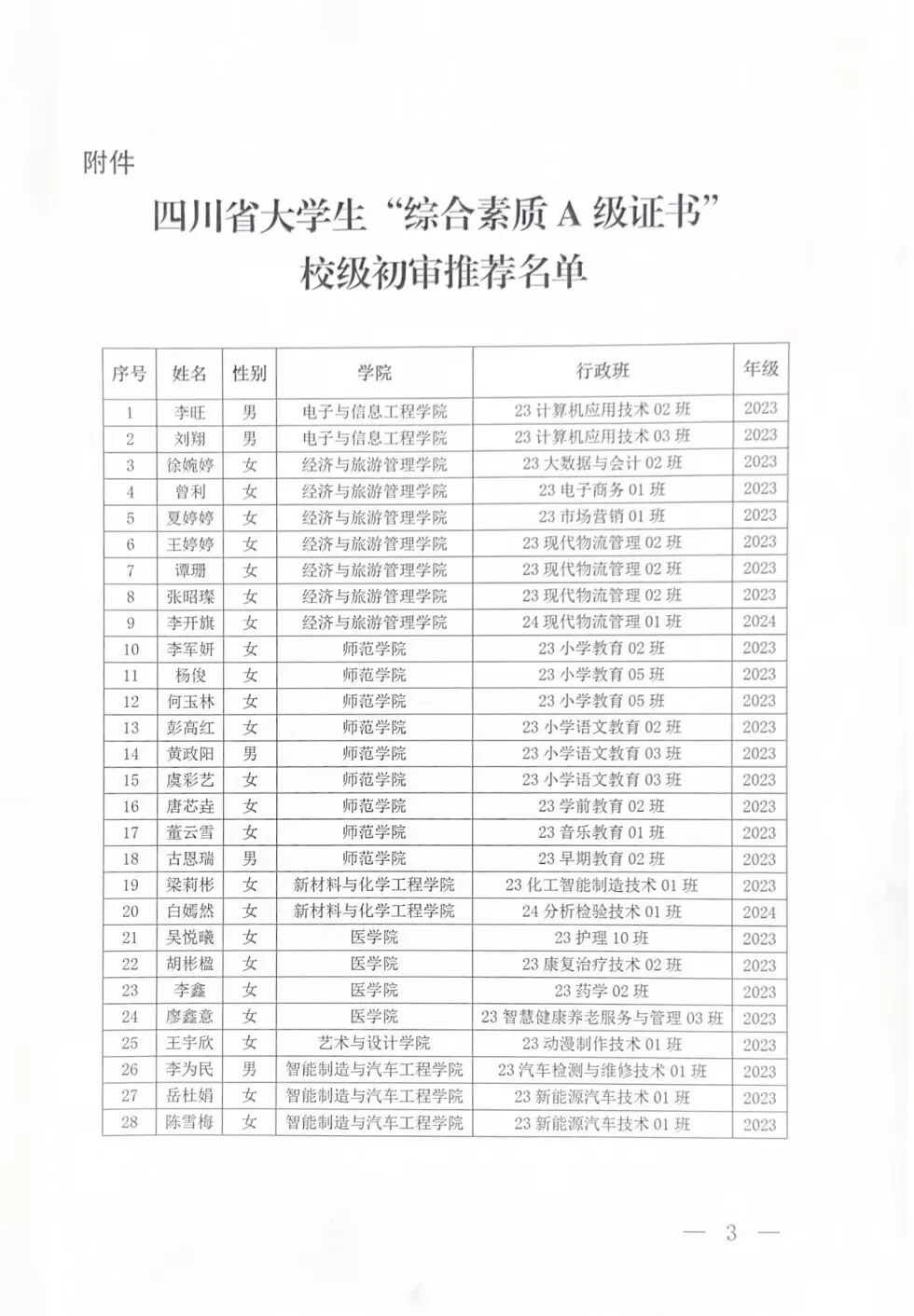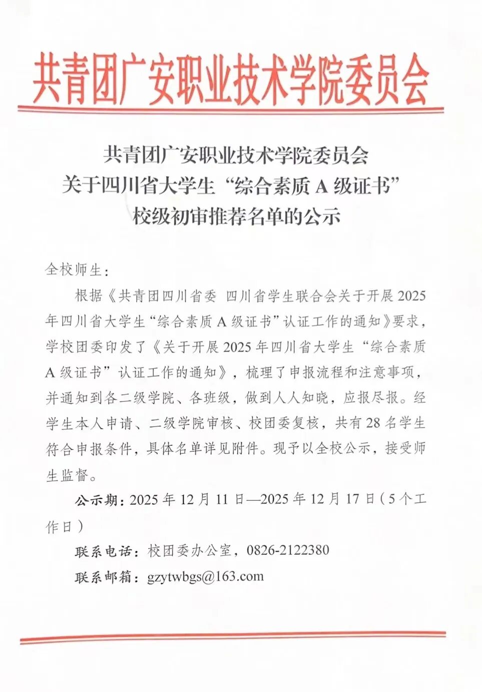关于四川省大学生“综合素质A级证书”校级初审推荐名单的公示